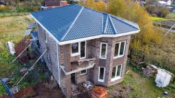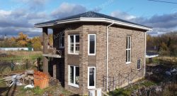 В этом доме 4 спальных комнаты, кухня, гостиная и 2 санузла. Капитальные стены из газобетонных блоков. Фасад дома из клинкерного кирпича с черным швом. Дом с эркером в гостиной и террасой на задний двор.